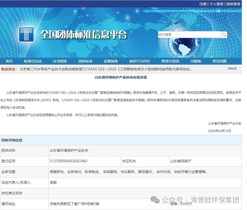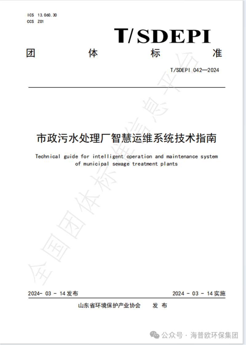 由海普歐環保集團主導、山東環境保護產業協會和山東建筑大學聯合起草,眾多環保企業參編的《市政污水處理廠智慧運維系統技術指南》團體標準于2024年3月14日正式發布并實施!
