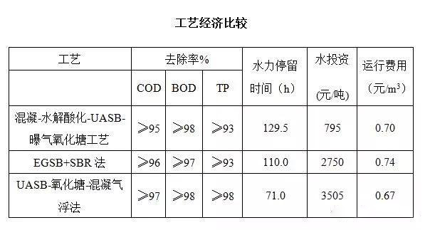 目前國內常用的工藝有混凝-水解酸化-UASB-曝氣氧化塘工藝、EGSB+SBR法、UASB-氧化塘-混凝氣浮法等,這些工藝處理淀粉廢水效率高,均能使處理后的水達到國家排放標準,其工藝技術經濟比較詳見下表。