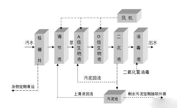 1、總體思路采用成熟可靠的A/O生物接觸氧化法為處理工藝,同時輔以格柵攔截、沉淀池澄清、消毒劑消毒等物化處理手段;